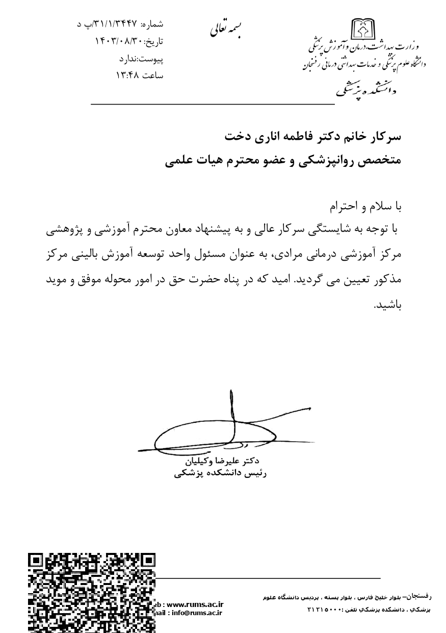 پست الکترونیکی mrmokhtaree@rums.ac.ir؛ تلفن تماس 34260080-